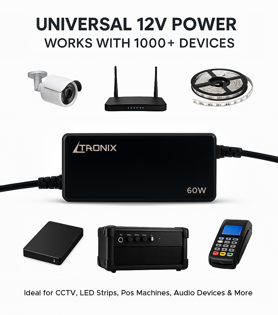 The Ltronix 12V 5A Power Adapter delivers stable 60W power for CCTV cameras, LED strips, routers, and small devices. Compact, safe, and durable, it ensures clean and uninterrupted DC power at home, office, or DIY projects.